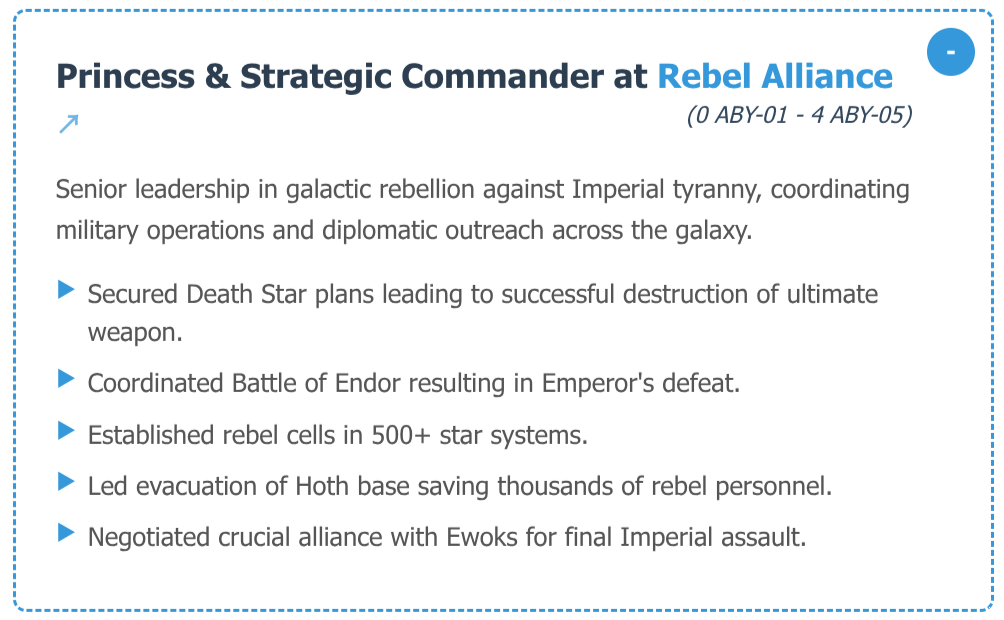 You can click a pen to go into edit mode. Editing isn’t text, it is contract (-) and expand (+) affordances to reduce the verbosity of sections. While I may gush about the origin story of Selenium an in-firm recruiter, then agent who’s taken my CV to them, the downstream interviewers are spectacularly uninterested in that so they’ll hit (-) to collapse that section. This will persist if you go on to print the resume/CV, but not if you close the tab.